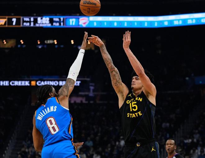 本场比赛,双方在首发阵容上面,雷霆这边派出的是,多尔特,杰威,华莱士,亚历山大和切特,勇士这边派出的是,穆迪,桑托斯,理查德,波杰姆斯基和波斯特。没想到勇士来了个田忌赛马战术,面对雷霆首发全部缺席。首节比赛开始,雷霆率先拿到球权,切特顶着防守强行跳投得手,打进本场比赛首个进球,理查德底角空位飙射三分也为勇士开张,亚历山大借掩护罚球线干拔命中,多尔特快攻篮下,顺势起飞扣篮挑落两分,穆迪抢断快攻,一条龙冲击篮下擦板得手,亚历山大的底角干拔三分球稳稳命中,卡鲁索空切内线抛投也打进一球。