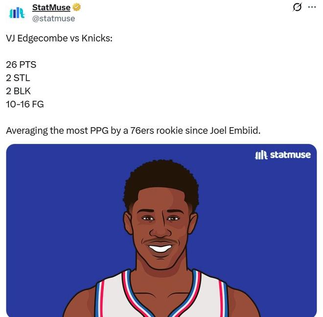 作为25年的新科探花郎,VJ埃奇库姆首秀打出历史级别表现后,一度因伤遭遇新秀墙,但在重返赛场后,VJ埃奇库姆重新证明自我,本场又交出傲人表现。